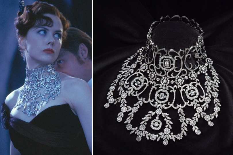 Patricia Canturi, the brand director of the Canturi label, said Canturi spent weeks researching late-1800s French jewelry for the necklace to be as accurate as possible. “He took inspiration from the Louis XVI style, openwork lace pattern, scrolls and splendorous bodice jewelry. The decadent necklace was meant to accentuate Kidman’s beautiful neckline and décolletage, and especially stands out amongst a sea of theatrical costume pieces worn by cancan dancers throughout the film.”