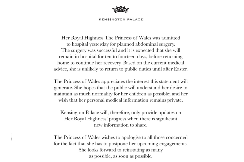 January 17, 2024: Kensington Palace announces Kate’s “planned abdominal surgery”