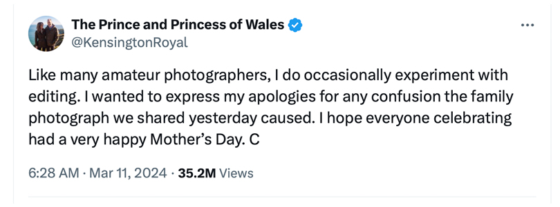 Kate issues an apology for sharing the edited image around 10:30am local time on Monday, March 11. In a statement released through Kensington Palace, she wrote: “Like many amateur photographers, I do occasionally experiment with editing. I wanted to express my apologies for any confusion the family photograph we shared yesterday caused. I hope everyone celebrating had a very happy Mother’s Day.” She signed it ‘C’ – for Catherine.