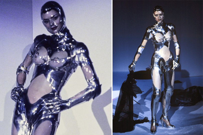 The collection itself combined couture construction with Mugler’s trademark sex appeal and featured ball-gowns with buttock cut-outs and lashings of black latex. Of course, the most memorable work from the 1995 collection came around twenty minutes into the show with a performance art piece that eventually revealed Mugler’s seminal ‘Cyborg’ suit. He had experimented with metal breastplates and sci-fi fantasies for years before this, taking inspiration from artists like Hajime Sorayama, but this look was truly next-level.